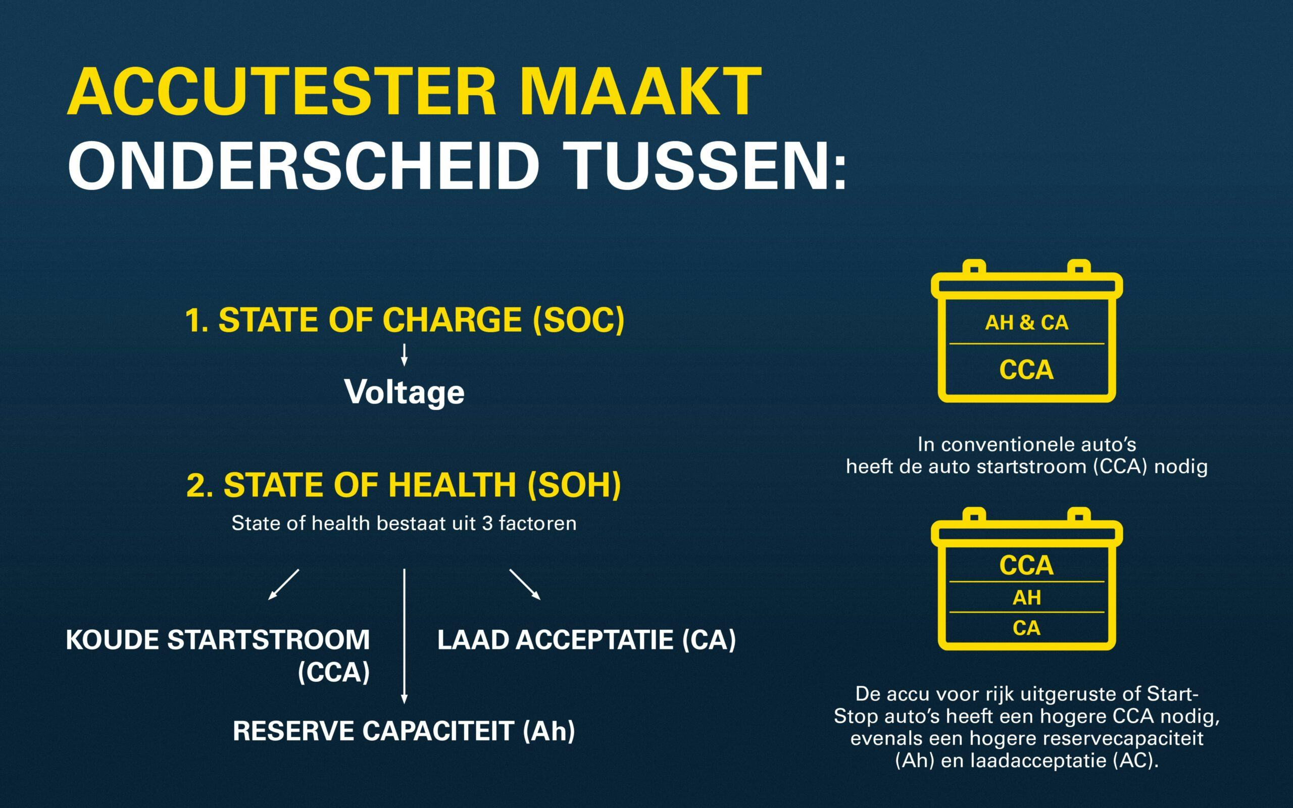Voor EFB‑ en AGM‑accu's is de gezondheidstoestand (State of Health, SOH) veel relevanter dan de ladingstoestand. Bij de SOH-test wordt de accu tijdelijk licht belast om te controleren of het zijn spanning vasthoudt en de cyclische belasting aan kan. De accutester let op de koudstartstroom (CCA), de reservecapaciteit (Ah) en de laadacceptatie (CA). Hoe meer lood in de accu, hoe groter de reservecapaciteit. Het aantal en het oppervlak van de loodplaten bepalen de koudstartstroom.