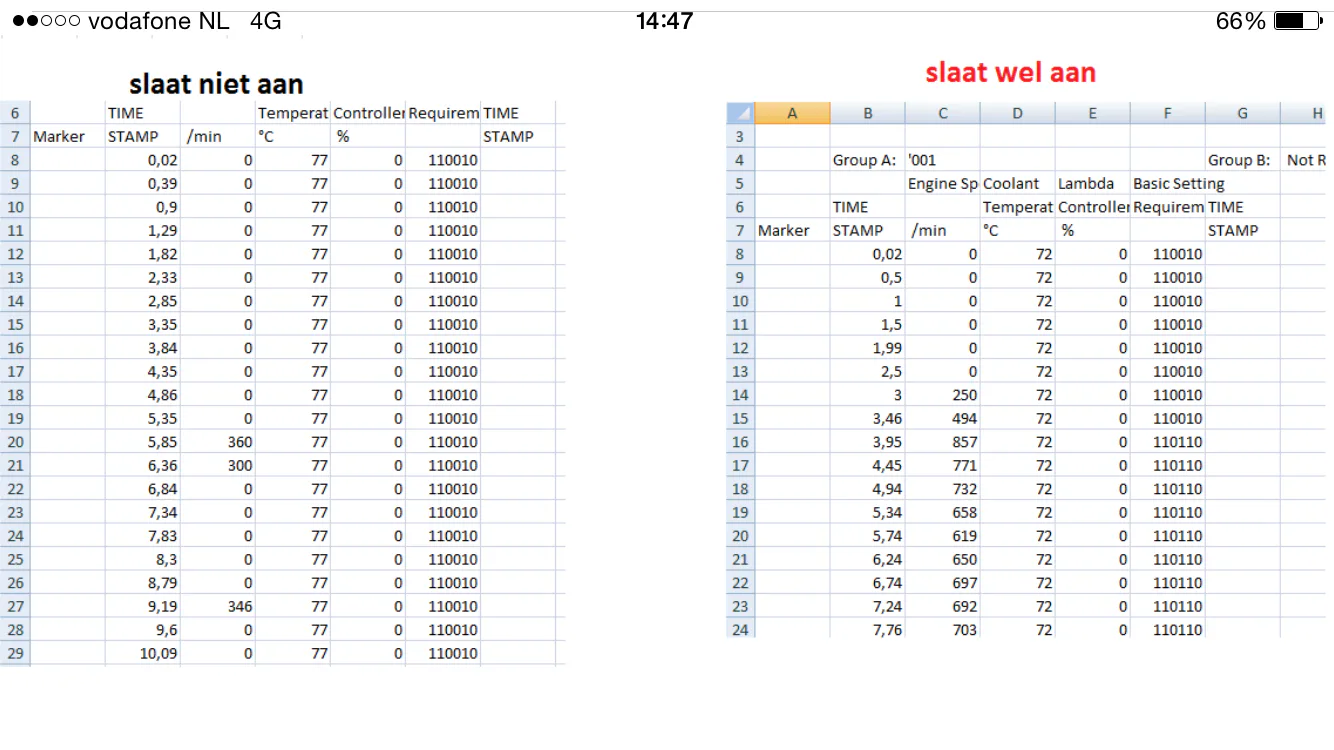 Er staat alleen een fout in de regeleenheid over de airco drukschakelaar. Dat klopt ook wel want de airco is leeg. Ik heb een log file gemaakt als de motor aanslaat en een log file als deze niet aanslaat. (zie bijlage). Het toerental signaal is niet plausibel als hij niet aanslaat. Als ik met een scoop meet op pen 82 signaal krukas komt daar wel een plausibel signaal aan. Als de motor loopt en ik rommel aan aansluiting 82 heeft dit geen effect. Ik mom dus toch weer op een regeleenheid uit.