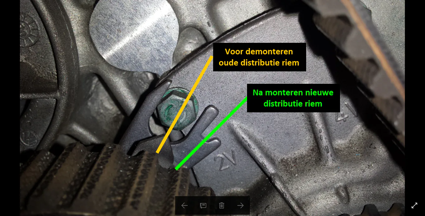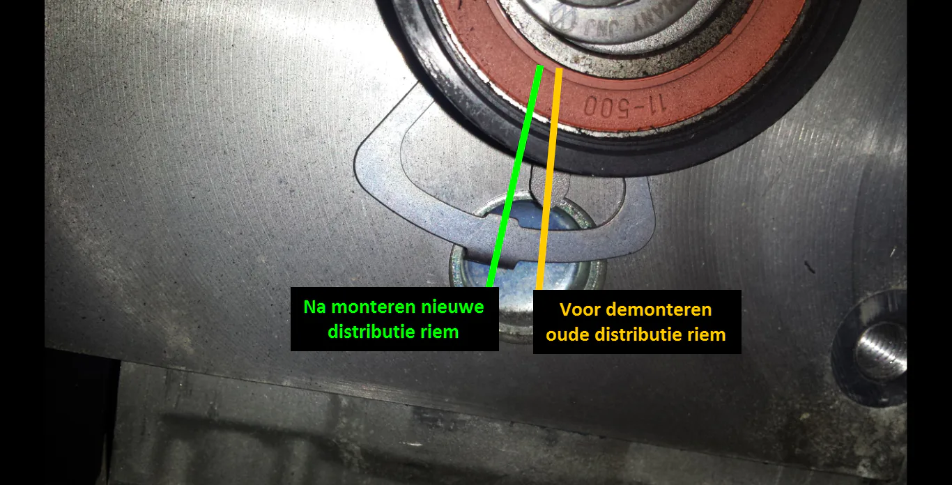 Na wat lezen op internet vraag ik me af of ik de riemen te strak gezet zou hebben. Voordat ik de oude riemen gedemonteerd had heb ik de foto's in de bijlage gemaakt. Het viel me toen op dat de riemen niet op spanning stonden volgens de markeringen. De spanners moeten toch gespannen worden zoals ik heb aangegeven met de groene lijnen?