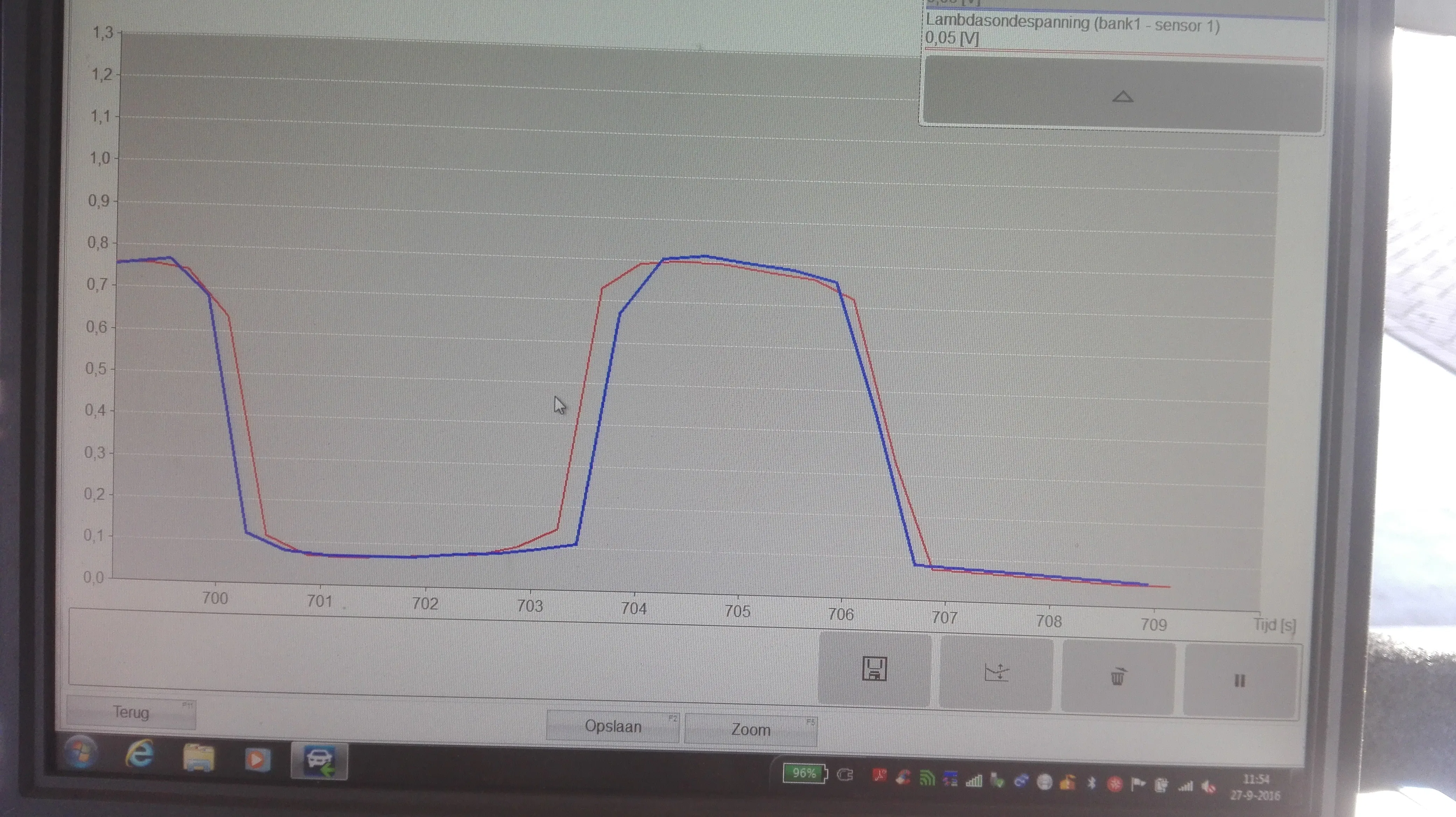 Wij hebben hier een sx4 staan waar foutcode p0420 terug blijft komen. 2e lambdasensor gedemonteerd en ziet er verder goed uit. Hij blijft alleen mee pendelen met de 1e. Af en toe blijft hij op 1,24v een tijdje staan om vervolgens weer mee te pendelen. Kat is al vervangen. Heb 4gas meting en afbeelding van meting bijgevoegd.iemand nog een idee?