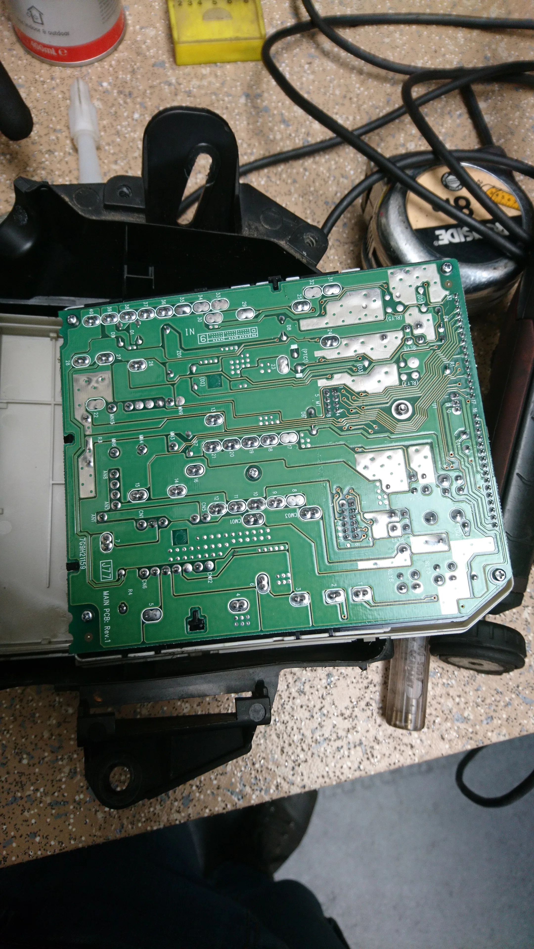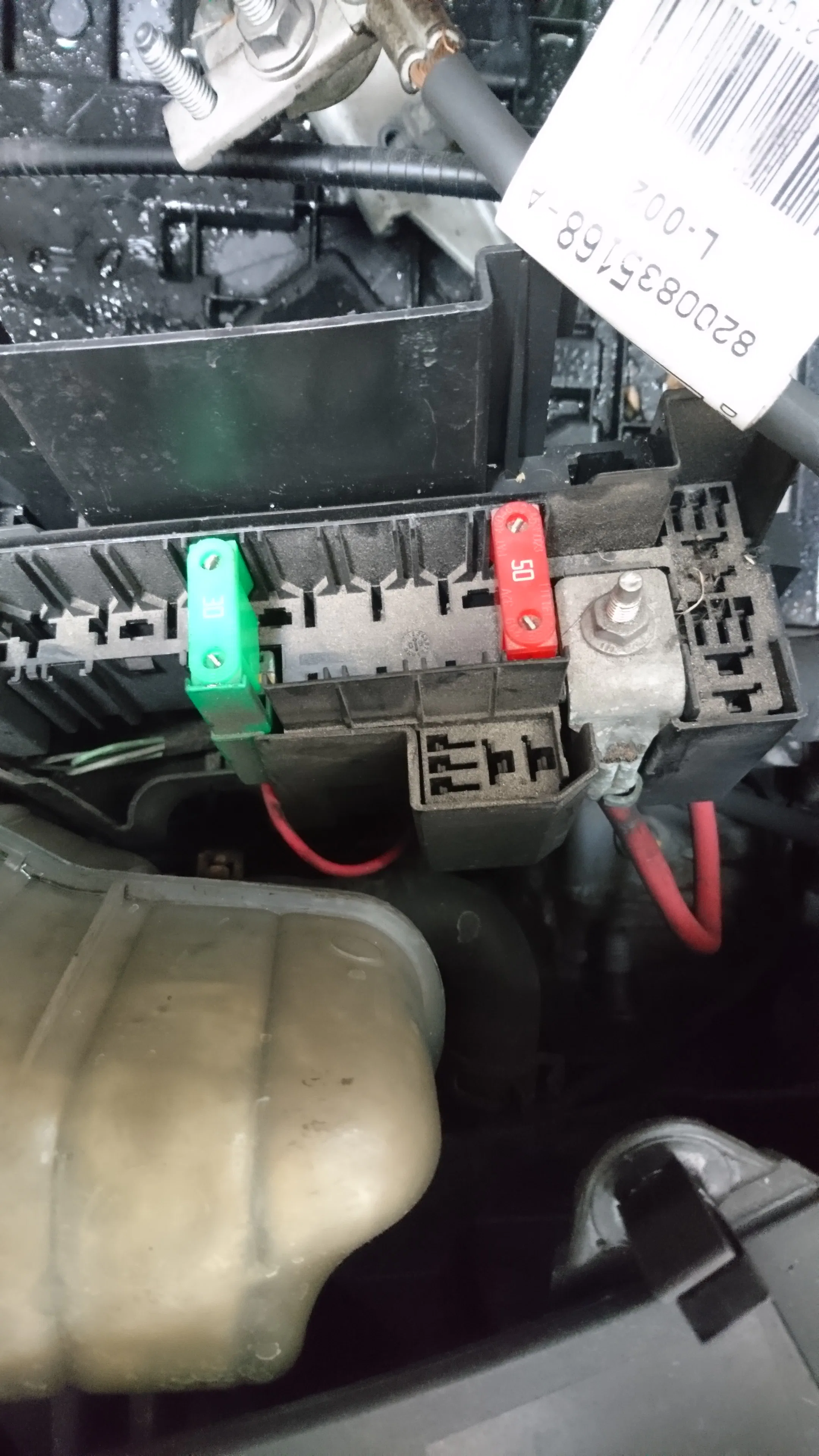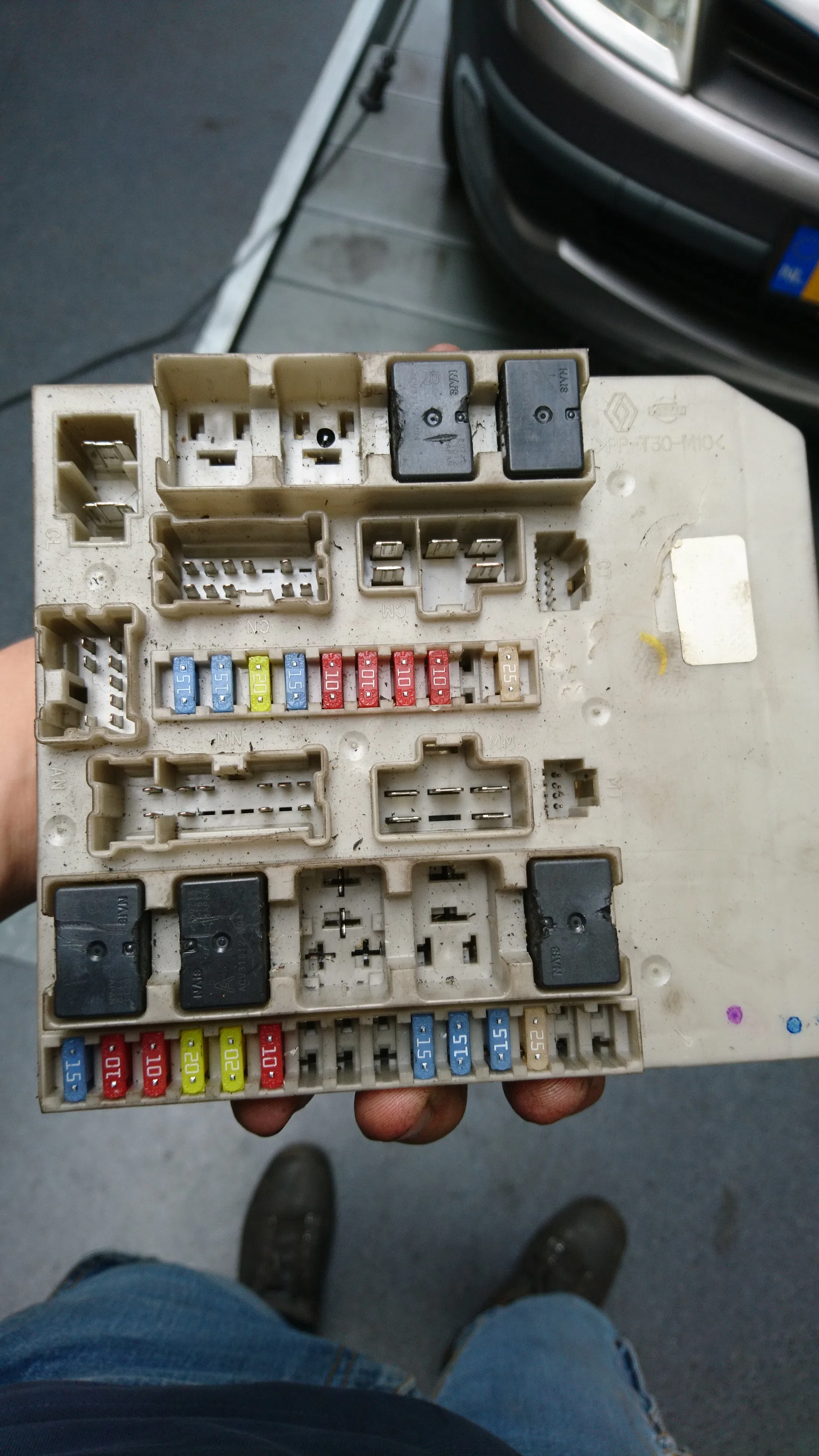 Ik loop nu vast bij de zekering/relaiskast. Blijkbaar vond Renault het een goed idee om de schema van de zekering/relaiskast in de motorruimte niet in het instructieboekje te zetten. Ik heb even de zekering/relaiskast eruit gehaald. De grote printplaat ziet er goed uit --> ook niet vochtig.