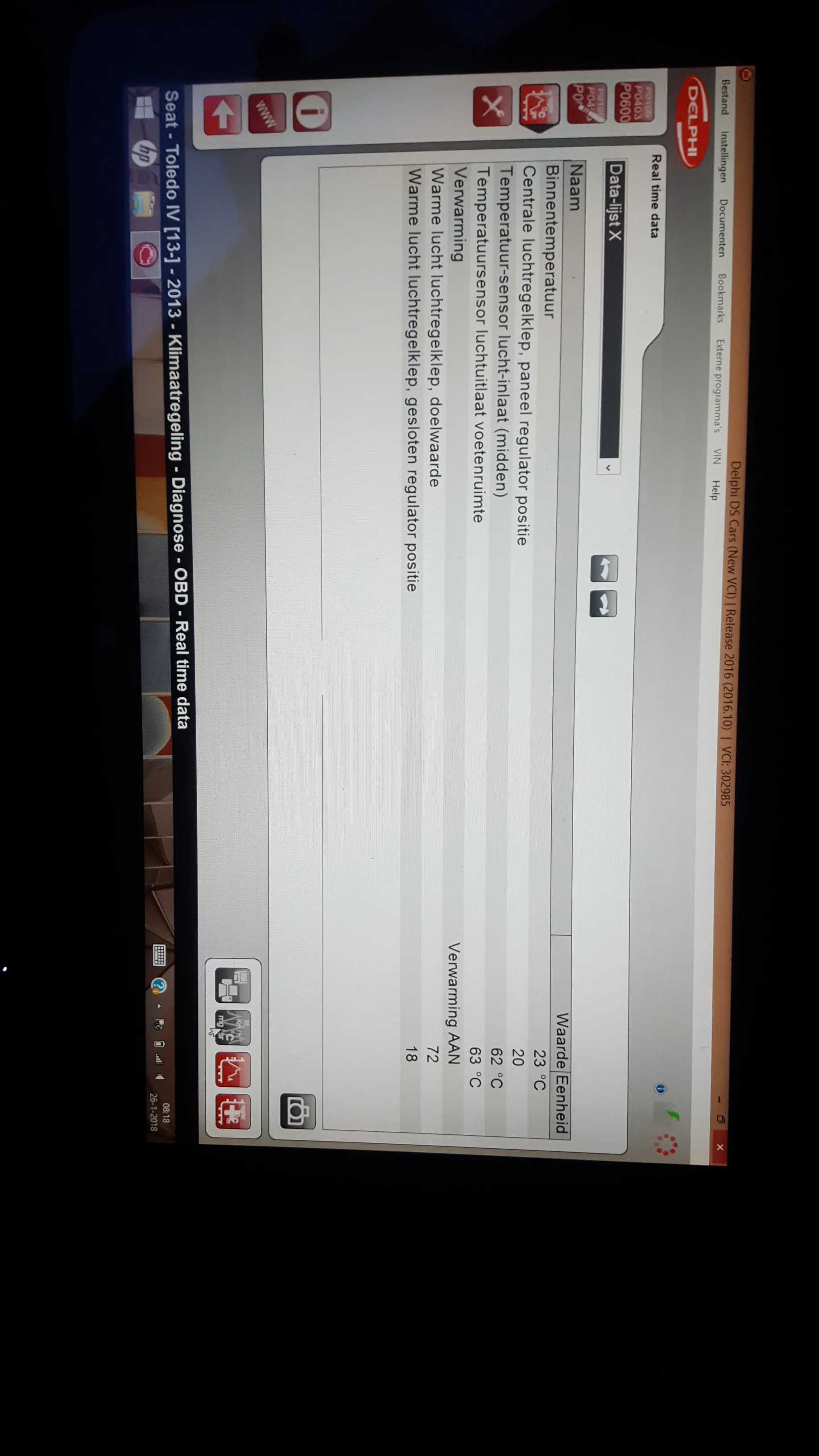 Seat Toledo staan die na 20km rijden alleen nog warme, 65 graden, lucht uit de roosters blaast. Je kan zien dat de regelklep op het kachelhuis op warm staat, terwijl de kachel zelf op koud staat. Als je het contact uit en aan doet gaat de regelklep direct naar koud en blaast er weer koude lucht uit de roosters. Regelklep en kachelunit zijn reeds vervangen en basisinstellingen van de kleppen uitgevoerd. Foutcode 01271 is opgeslagen. Deze code is al aanwezig terwijl de kachel nog goed werkt in de eerste 20km rijden.