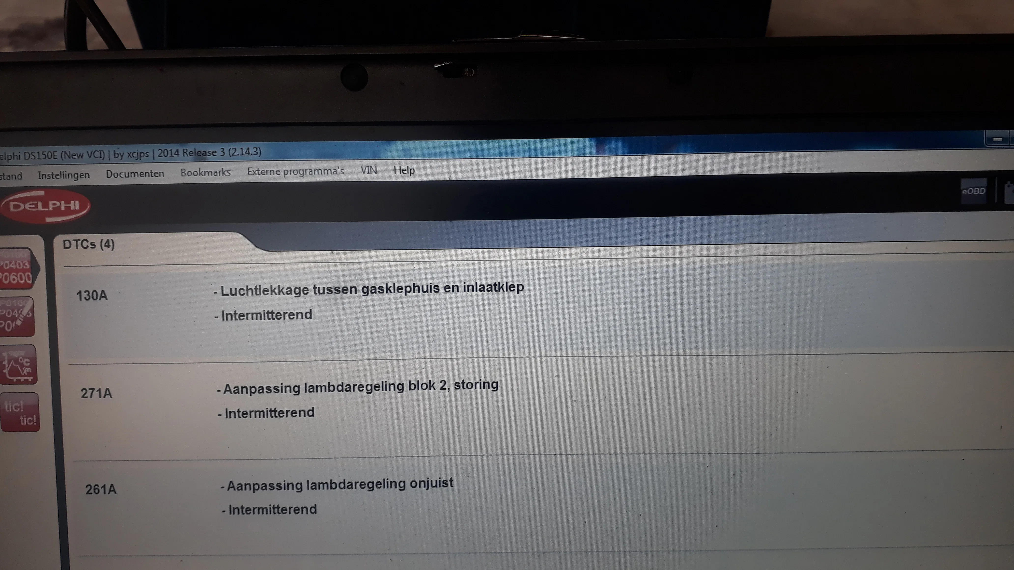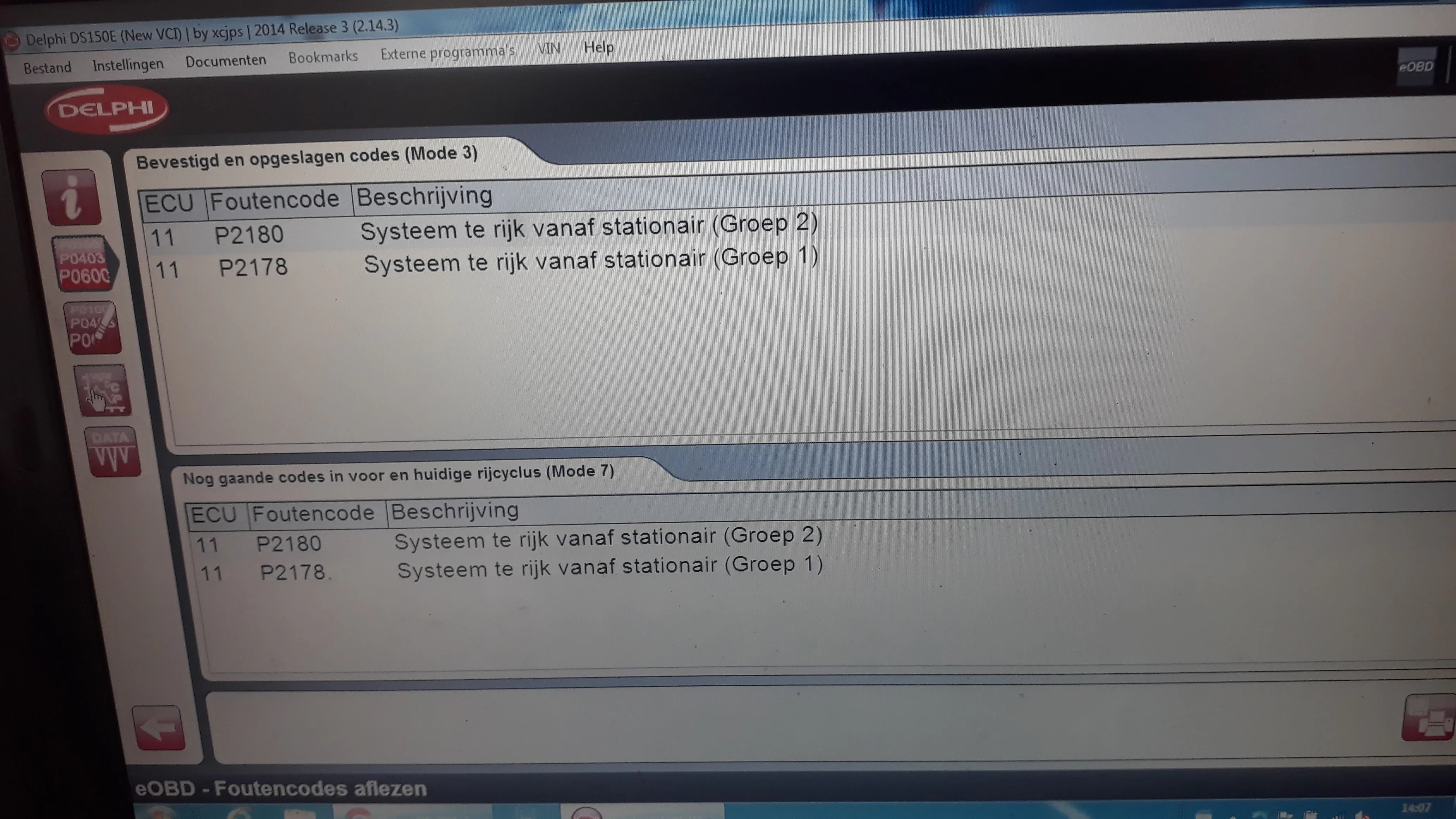 130A = Luchtlekkage gasklep inlaat 271A = Aanpassing Lambdaregeling blok 2 261A = Aanpassing Lambdaregeling onjuist EOBD: P2180 : Systeem te rijk Groep 2 P2178: Systeem te rijk Groep 1