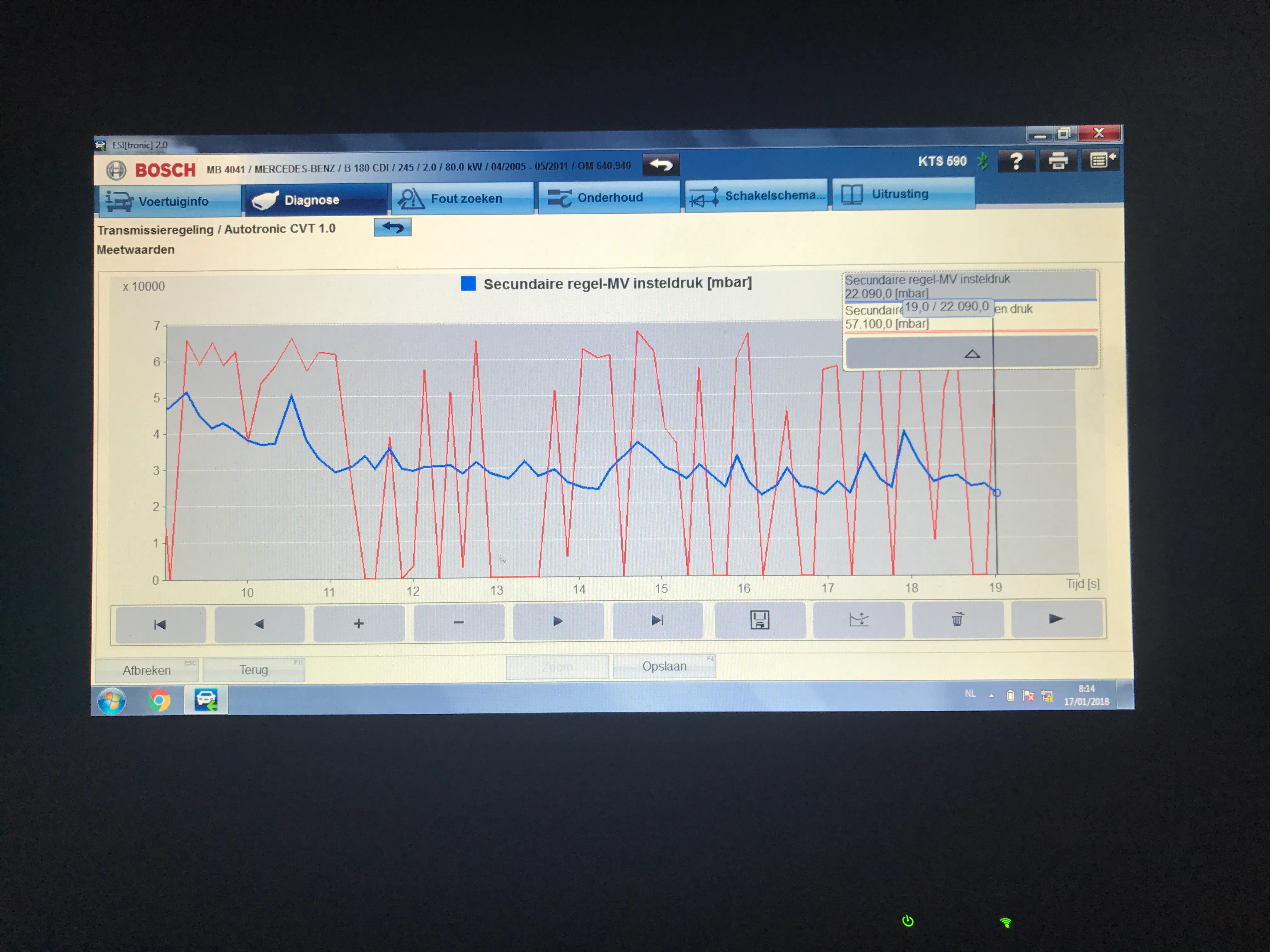 Deze B-klasse gaat in noodloop, en geeft een fout op de oliedruk in de automaat. Automaat gespoeld met powerflush maar probleem blijft aanwezig. In bijlage foto van de drukverlopen. Slingerend drukverloop is niet constant, meestal lopen de gemeten en effectieve druk nagenoeg gelijk.
