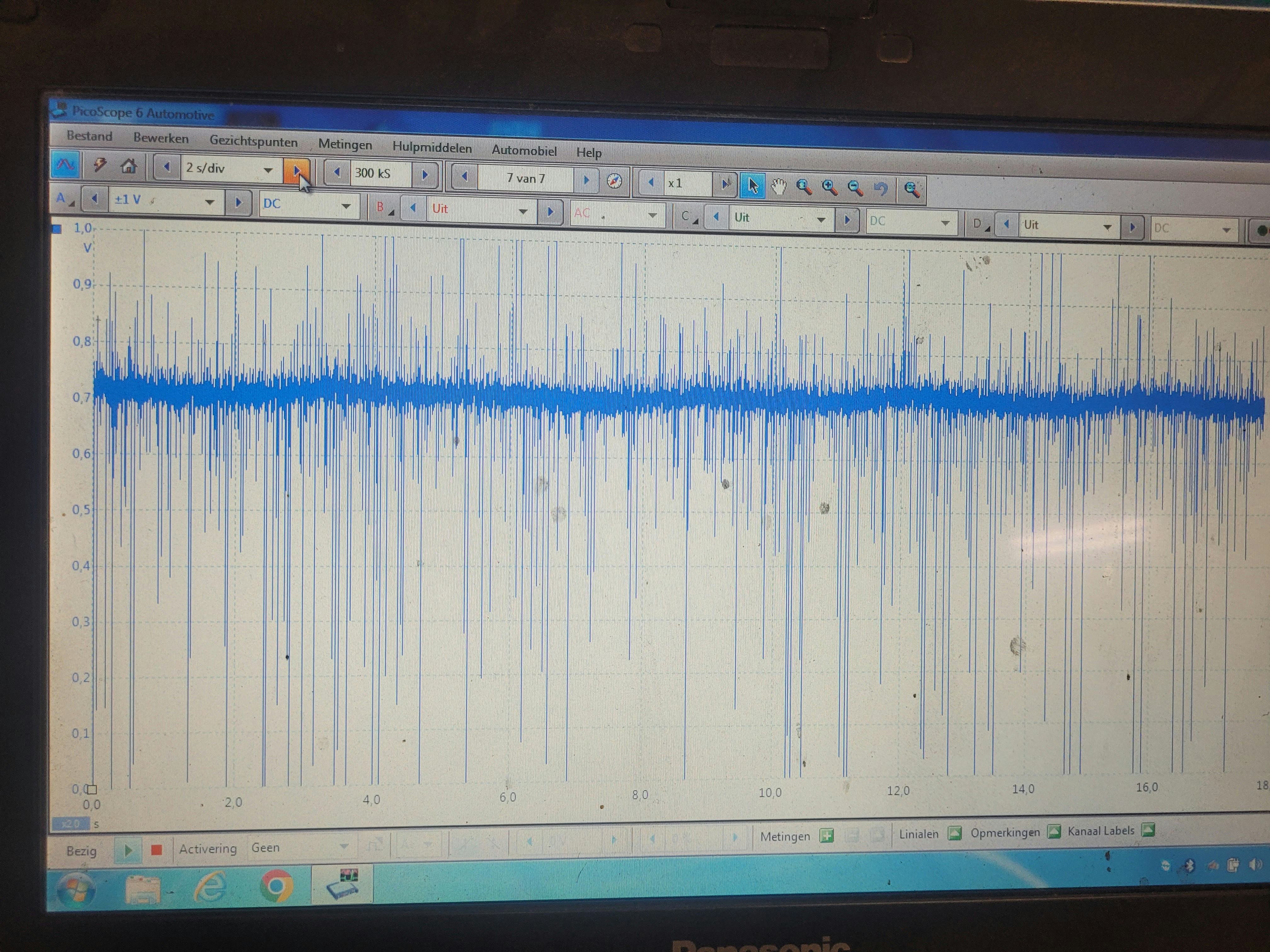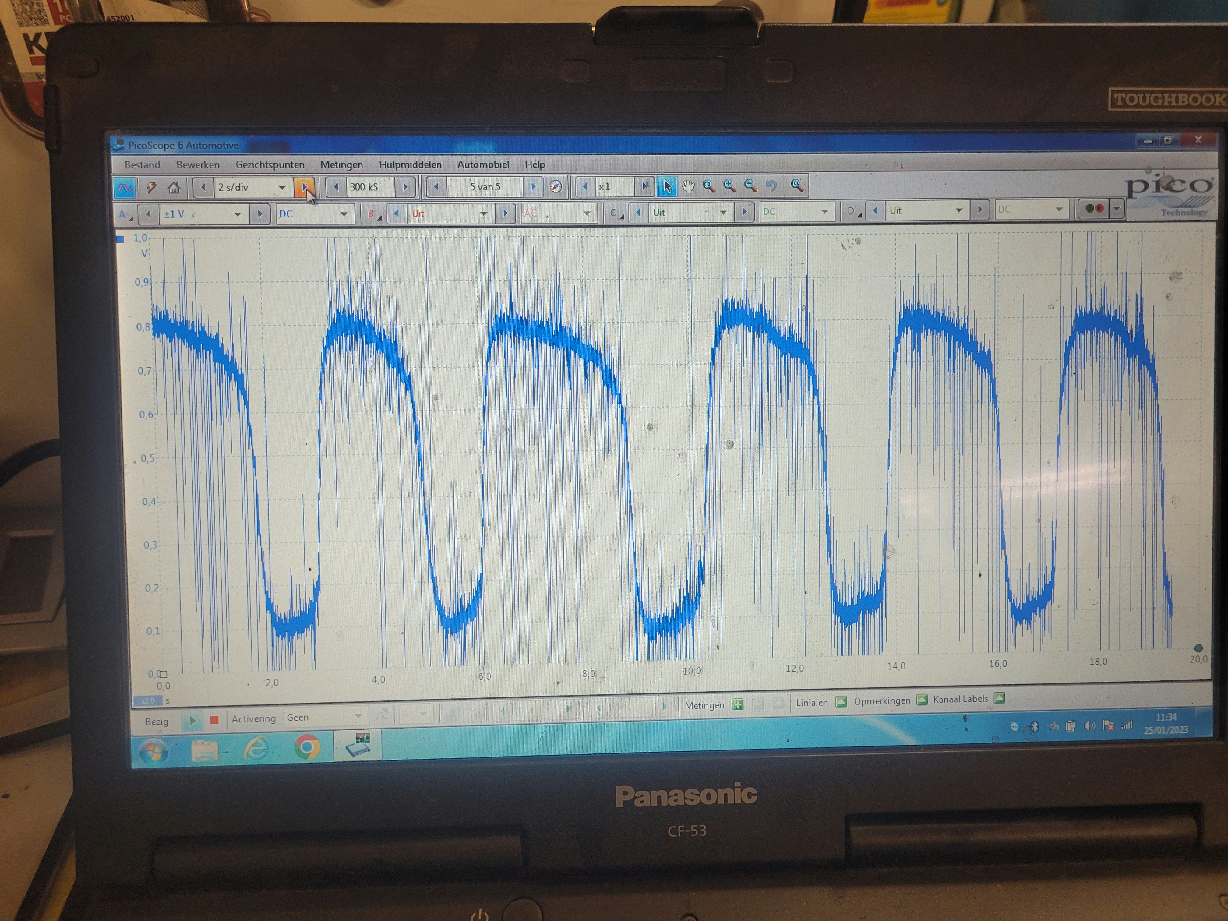 Uitgemeten met ostilloscoop. Lambda voor cat varieert tussen 0.1 en 0.8. Lambda na cat blijft contant op 0.75. Bij gas geven (alsook tijdens testrit) gaat deze waarde naar 0.14 . Deze waarde blijft dan stationair zo gedurende 1 minuut om dan terug naar 0.75 te gaan.