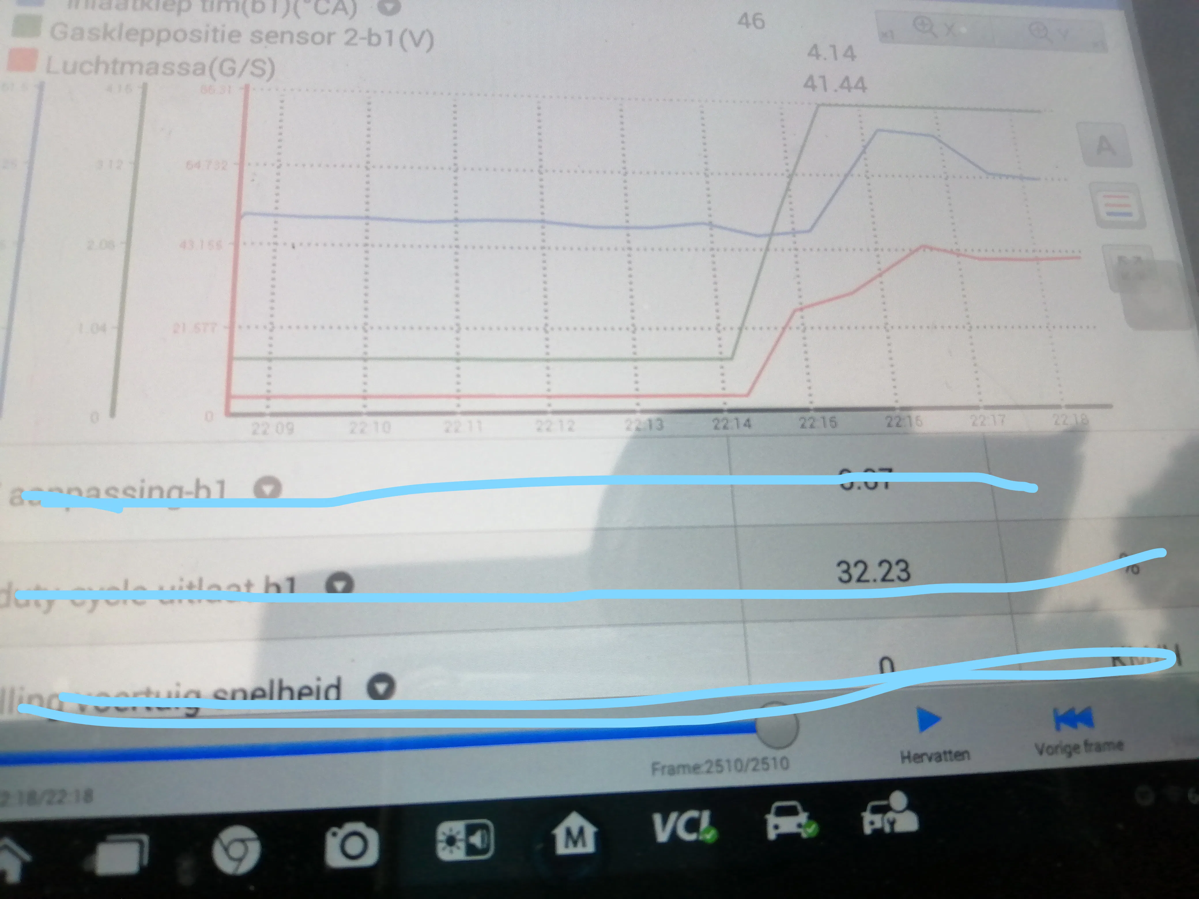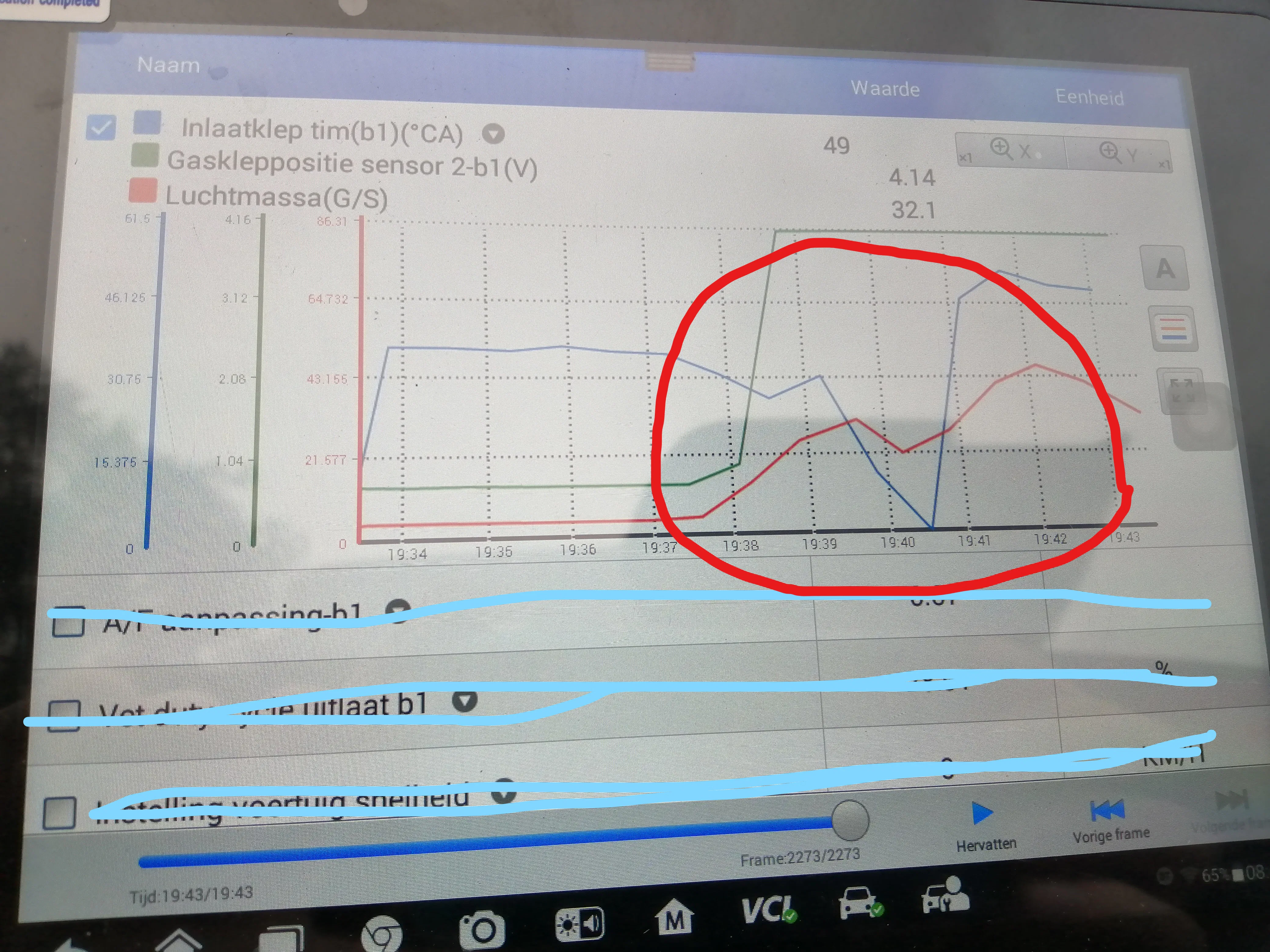 Ik ben zelf een heel stuk gaan rijden met de diagnose tester en zie telkens als het probleem zich voordoet dat de luchtmassa een dipje geeft. (dit verklaart het inhouden) Dit terwijl de gasklep volledig geopend blijft.