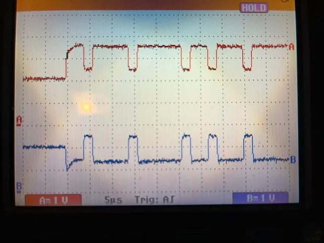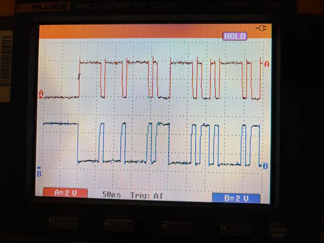 Ik heb de motor-can bus gemeten, groen+groen/wit. De eerste foto is op kontakt, dat ziet eruit zoals ik zou verwachten. Ik heb nooit eerder gemeten, wat ik ervan weet komt uit AMT. Bij kontakt uit, de 2e foto blijft de can - bus nog even actief. De 'rust' spanning zakt van 2,5V naar ongeveer 2V en het signaal ziet er net wat anders uit.