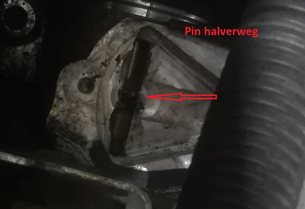 Pin voor de sensor staat halverwege na reparaties waarbij koppeling en gaffel (origineel) zijn geplaatst (foto 2), stond eerst ruim verder naar voren (idd geen slag dus). en vervolgens na afstellen pin tot 22 mm (foto 1)