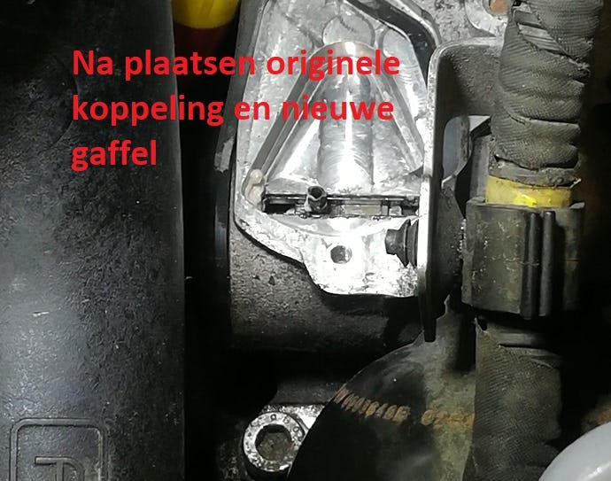 Slag koppeling is te klein: originele koppeling vervolgens door de garage laten plaatsen en gaffel vernieuwd, komen 2 mm in de richting, niet voldoende. Pen op unit opgedraaid, nu ongeveer 22mm op contact. Koppeling wil nu inleren en auto kan weer netjes in de achteruit, maar wil slecht in vooruit. Als je schakelt van N naar vooruit probeert systeem maar valt uit versnelling, probeer je nog eens dan soms wel.