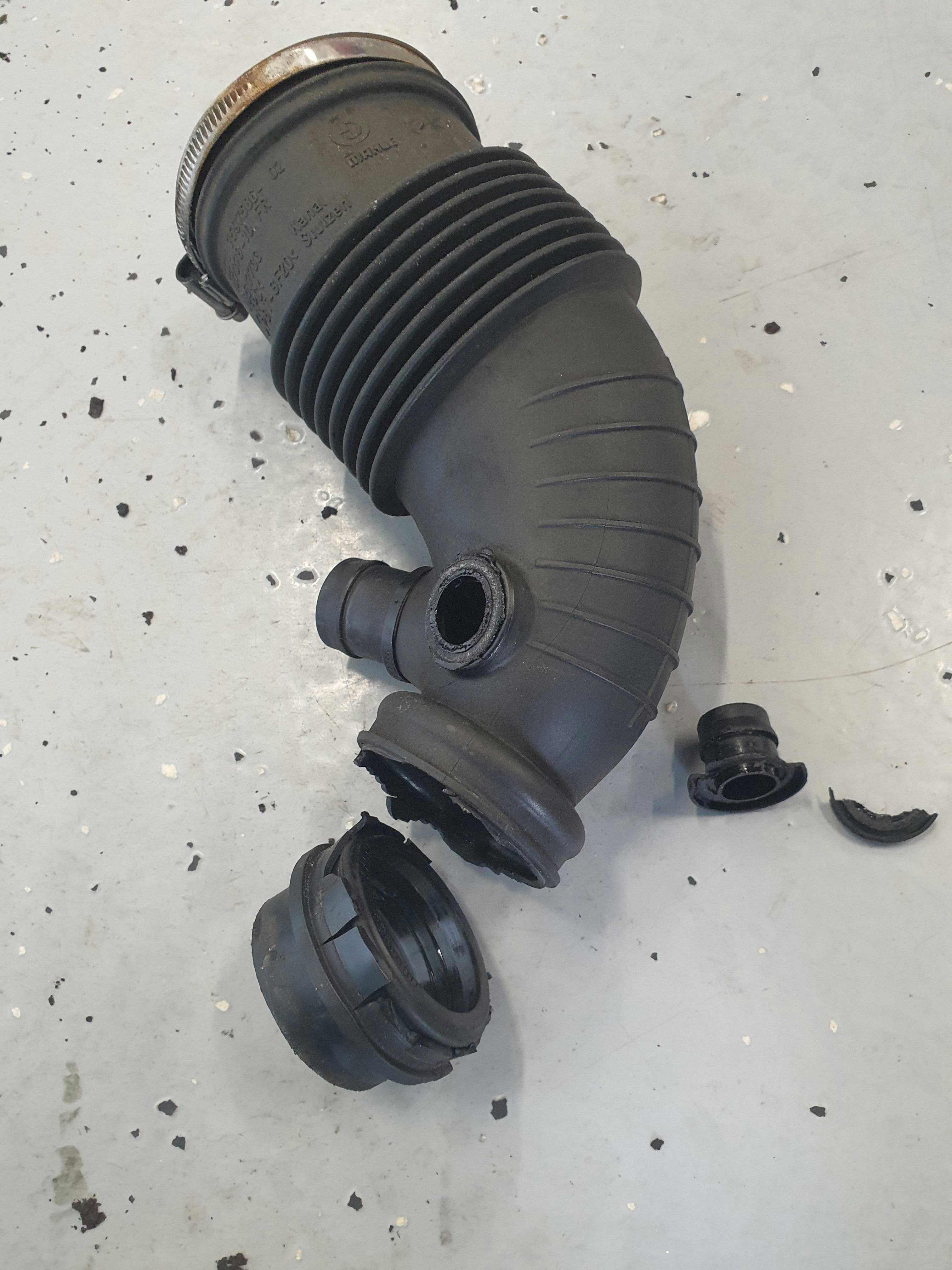 Na het uitlezen krijg ik 1 foutcode, namelijk P00BD signaal lmm onaannemelijk. Na een blik onder de motorkap zie ik dat de aanzuigbuis van de lmm naar de turbo gescheurd is. (Zie bijlage). Na het vervangen van de slang blijft echter het probleem. De storing van de lmm kan gewist worden en blijft tijdens het slechte stationair draaien ook weg. Pas als er gereden wordt en er is een hik voelbaar dan komt de code terug.