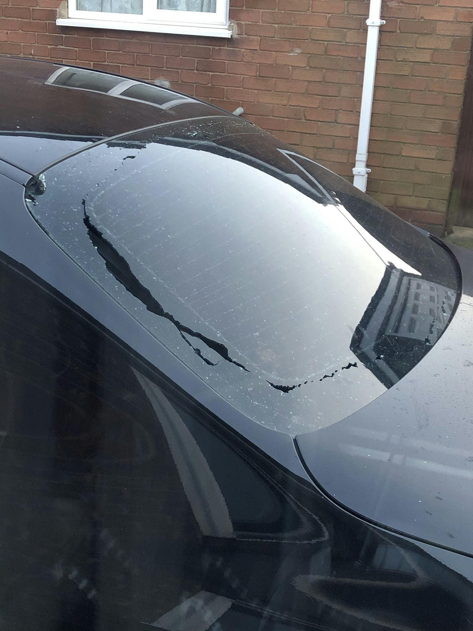 De schade is net zoals bij deze, vooral aan de bestuurderskant grote stukken uit het glas weg. De barst loopt bijna helemaal rondom, alsof het middelste deel van de ruit en de buitenrand elkaar niet meer konden uitstaan...