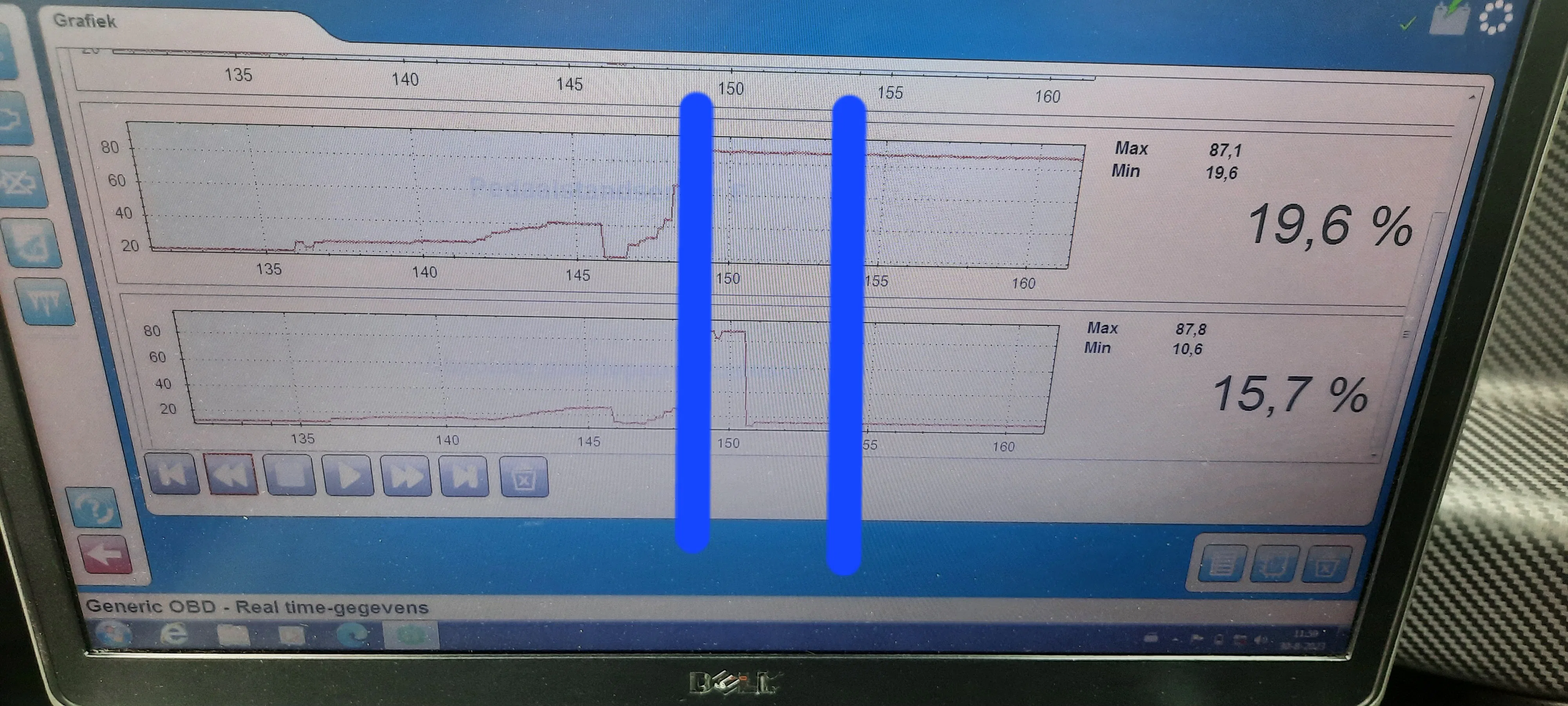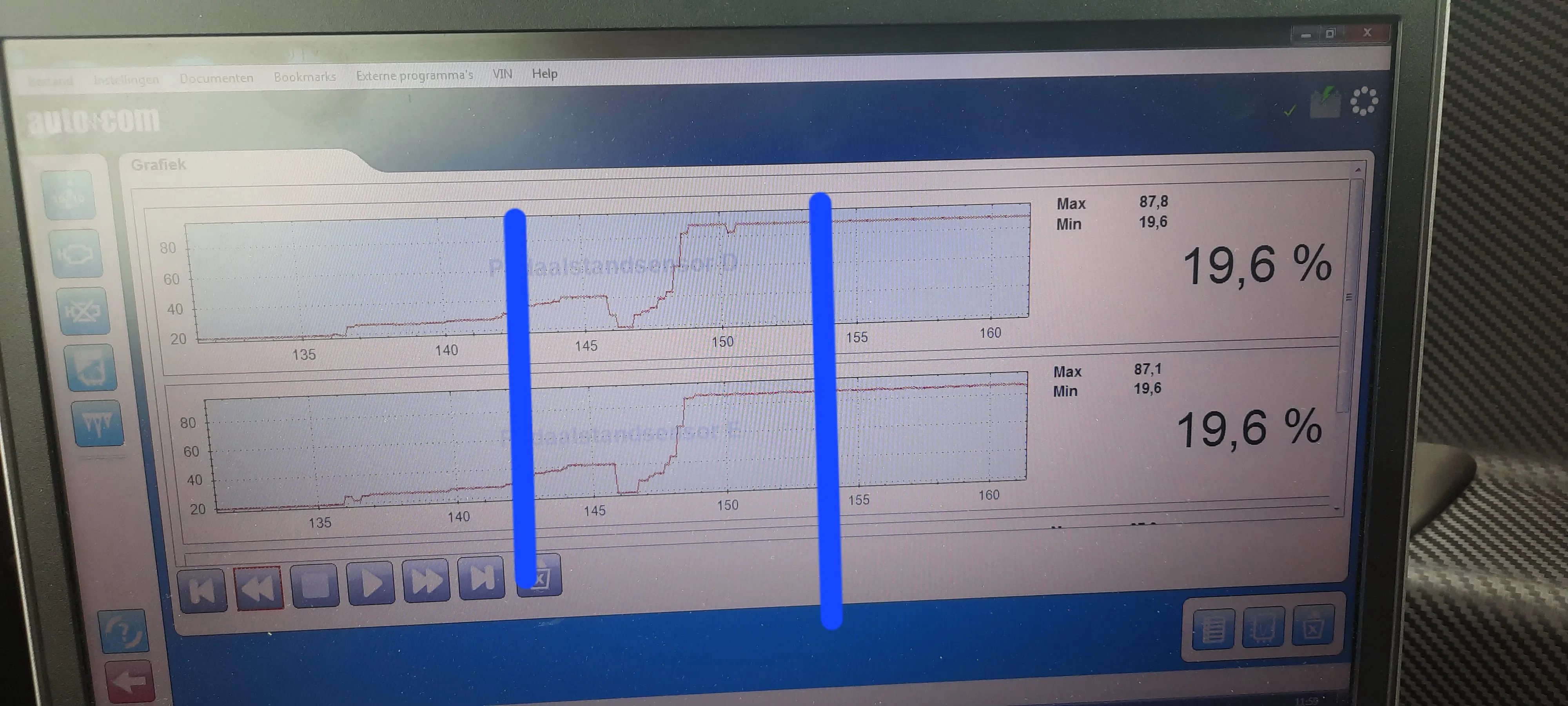 Tussen de blauwe lijnen op de foto ging de auto in storing. Zelf zie ik een dipje in het gaspedaal signaal maar zorgt dit voor de noodloop?