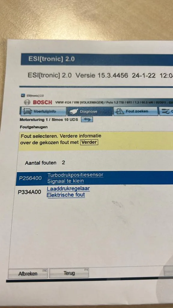 Auto binnengekregen met epc melding en verminderd motorvermogen, na uitlezen laaddruk regelaar uitgewisseld met ander voertuig (zelfde onderdeelnummer) storing blijft terug komen en laaddruk regelaar is niet in te leren ook dealer krijgt deze niet ingeleerd, modificatie (plaatje tussen aanligvlak en klep en softwareupdate is uitgevoerd)