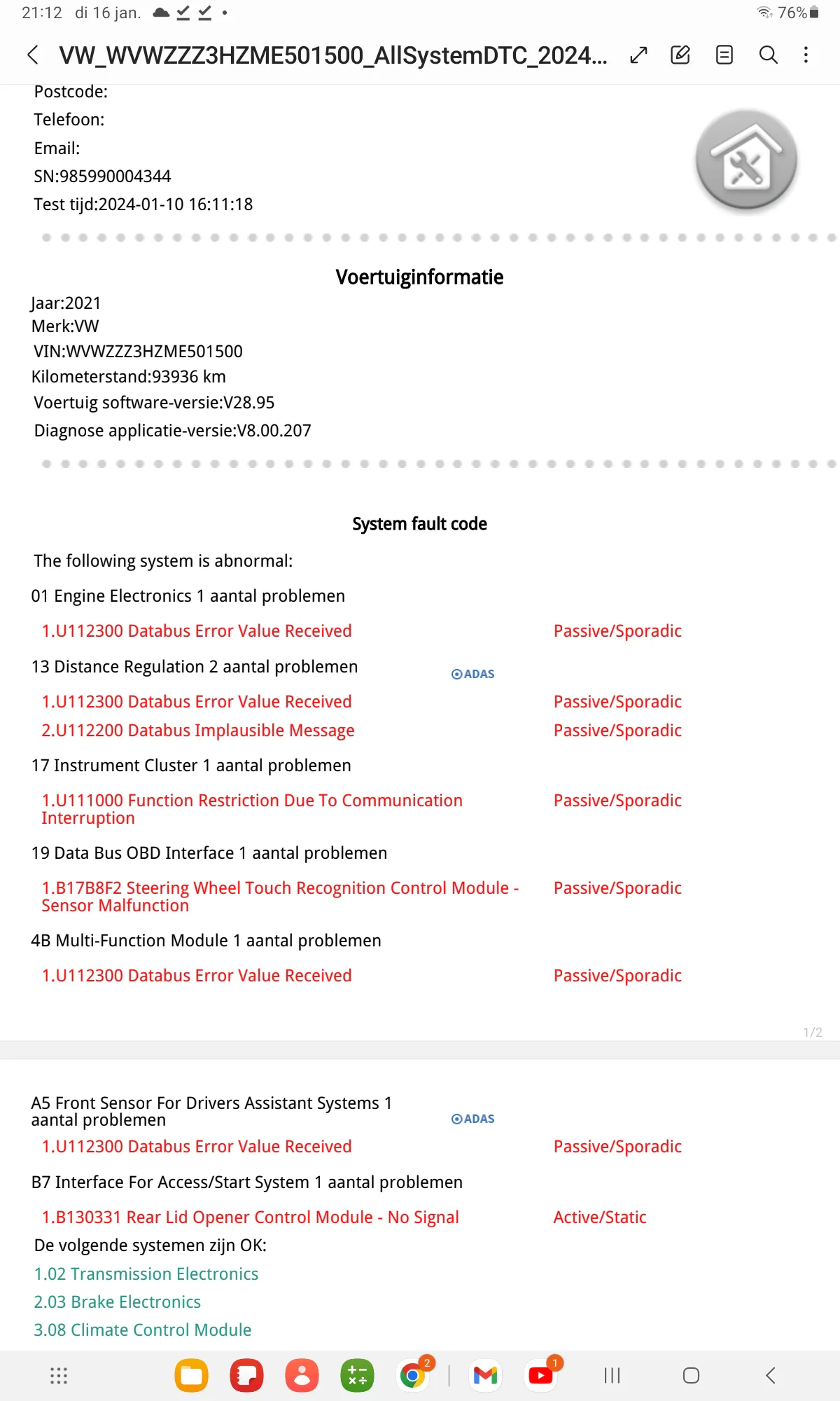 Soms verschijnt deze melding. De cruise valt dan ook uit. Na het uitlezen zijn er dan databus fouten en in 19 data bus obd interface 1 staat dan b17b8f2 steering wheel touch recognition controle modul-sensor malfunction.