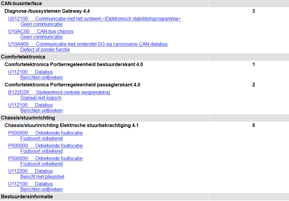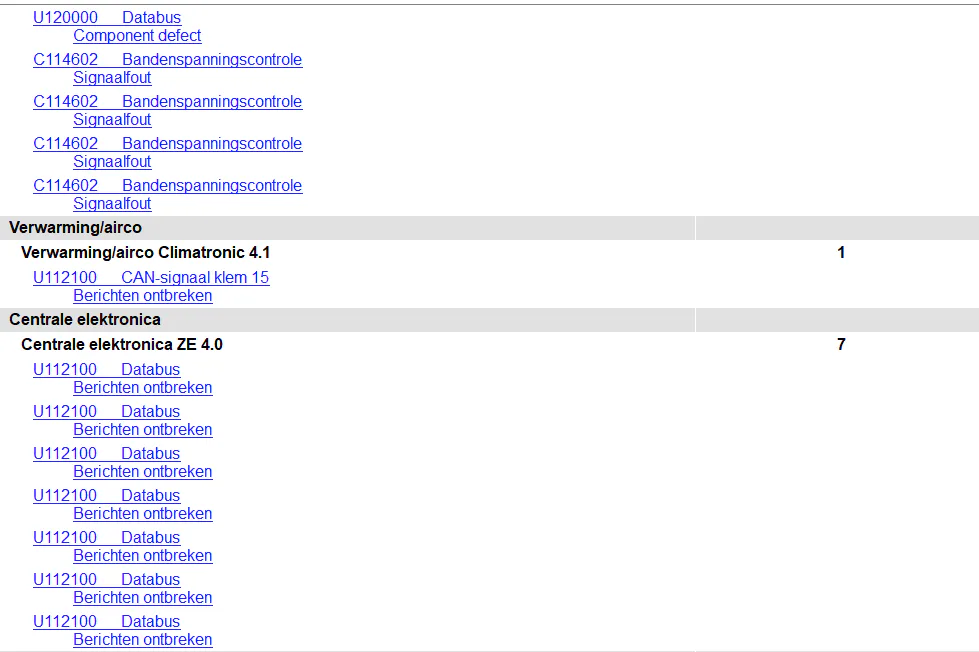 De accu was aan vervanging toe alsook het wiellager linksvoor. Deze onderdelen vervangen, maar schoot dezelfde dag weer in storing. Wederom uitgelezen en daar komen onderstaande storingen uit (zie bijlages).