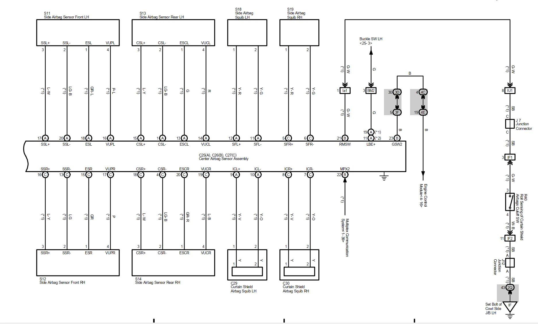 Ik ben bezig om een landcruiser om te bouwen naar een pickup, nu zitten achterin de auto 2 airbag sensoren voor de gordijn airbags. Deze sensoren (s13 en s14 van de bijlage) zijn niet meer nodig en wil deze sensoren afgekoppeld hebben. Nu geeft de ecu uiteraard direct een foutmelding als je die los laat. De gordijn airbags zijn al vervangen door een weerstand.