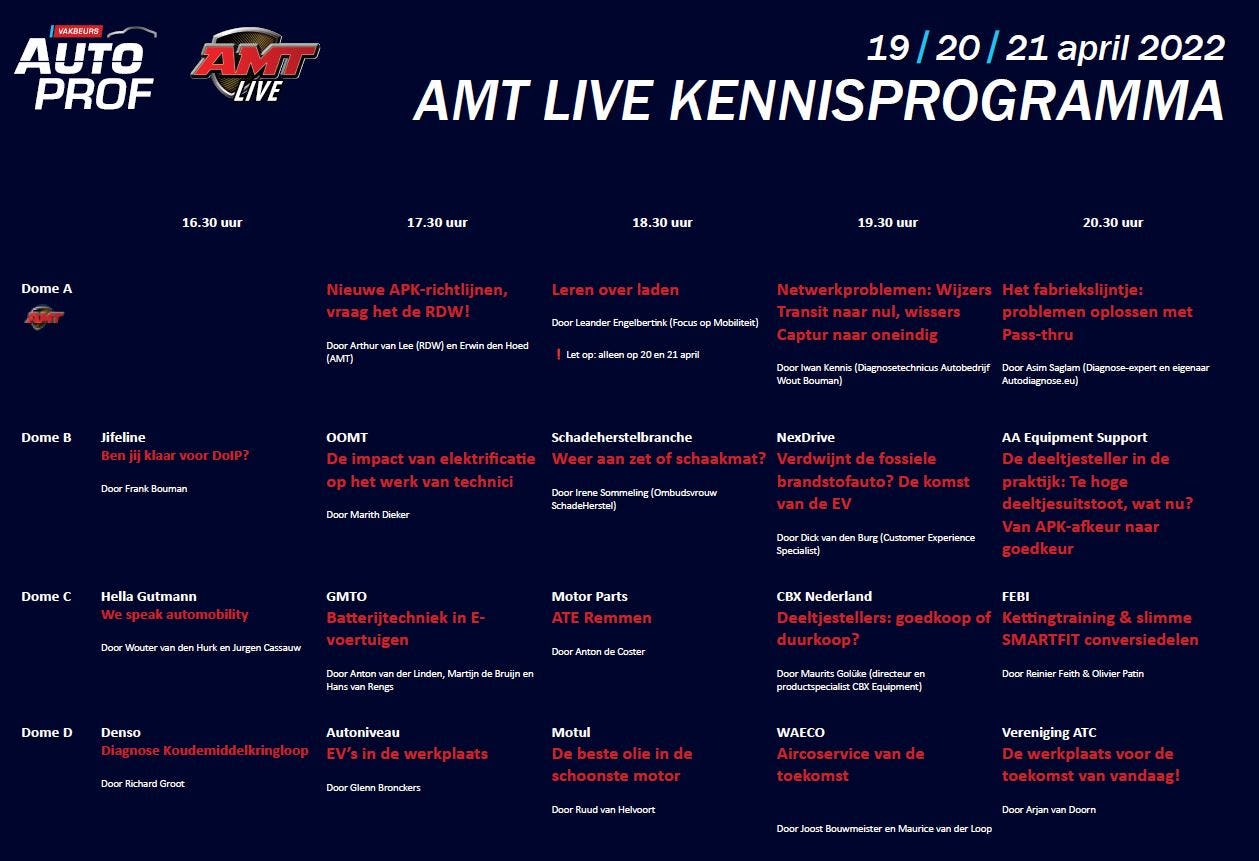 Vanuit AMT verzorgen we weer het kennisprogramma, waarbij je diverse kennissessies kan volgen van zowel toeleveranciers, als (diagnose) experts ingeschakeld door AMT. Je treft er onder andere AMT Topmonteur @iwan aan in een van de theaters.