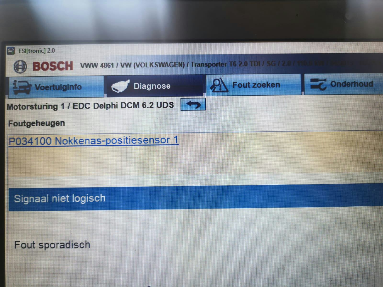 Ik ben begonnen met uitlezen, Er zaten div storingen in, mbt nox kat, roetfilter, Egr klep en de nokkenas sensor. Eerst de hele boel gewist en een proefrit uitgevoerd, auto sloeg idd slecht aan, maar met rijden niet direct wat te merken, wat traag met optrekken onderuit. De enige code die terugkomt is P034100 Nokkenas-positiesensor 1 signaal niet logisch, fout sporadisch. Terwijl de auto bij ons staat gaat deze steeds slechter aanslaan, en op den duur slaat deze alleen nog aan met de stekker van de nokkenassensor eraf. Distributiekap weggehaald, en komt een stuk v-riem tussenuit. Timing gecontroleerd, staat er enkele tanden naast. D-riem vervangen met juiste afstelgereedschap op tijd gezet. Hiernaar slaat de motor helemaal niet meer aan, ook niet met stekker van nokkenassensor af.