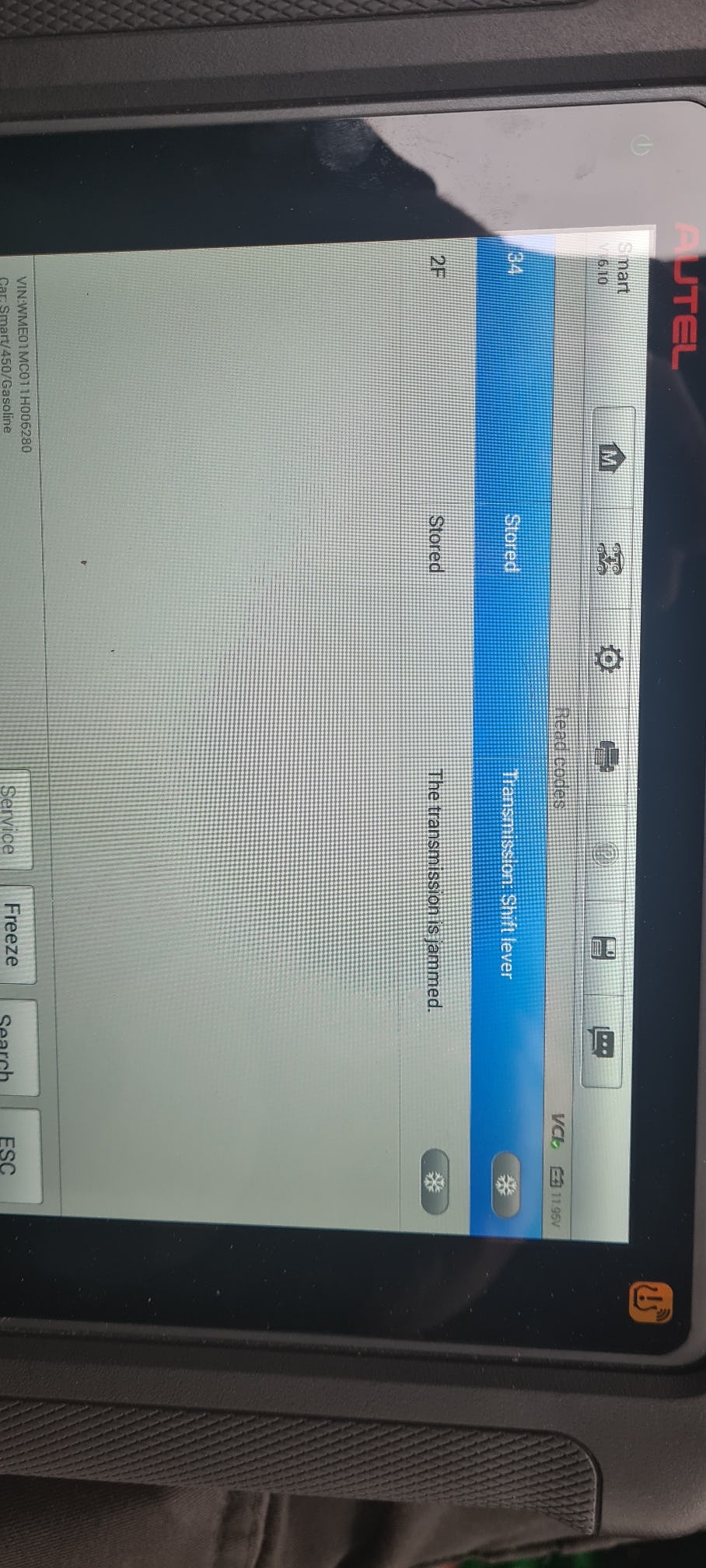we hebben hier deze Smart ForFour uit 2001 binnen staan met een storing op/aan de semi automaat. Auto kan gestart worden, versnelling kan ingeschakeld worden maar dan begint er een geluid of gevoel te komen dat de bak iets wil pakken of dat er wrijving ontstaat en dat gaat dan op en af. Nadat dit een keer of 8 zo gegaan is springt de semi automaat op storing en verschijnen er 3 balkjes in het display.