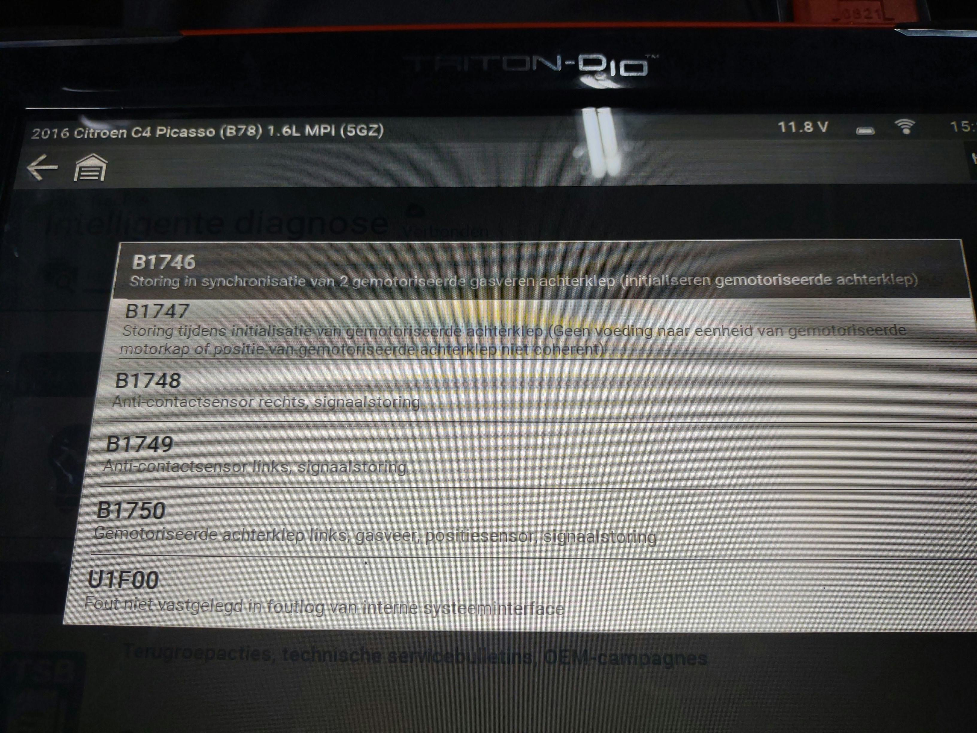 Wij hebben een C4 Picasso binnen met als probleem dat de achterklep niet gemotoriseerd open of dicht wil gaan. We kunnen de klep wel openen en sluiten middels een actuatortest met onze Snap-on diagnose computer. Foutcodes hebben we genoeg: B1746, -47, -48, 49 en -50 en nog U1F00. Bijbehorende omschrijvingen op bijgevoegde foto.