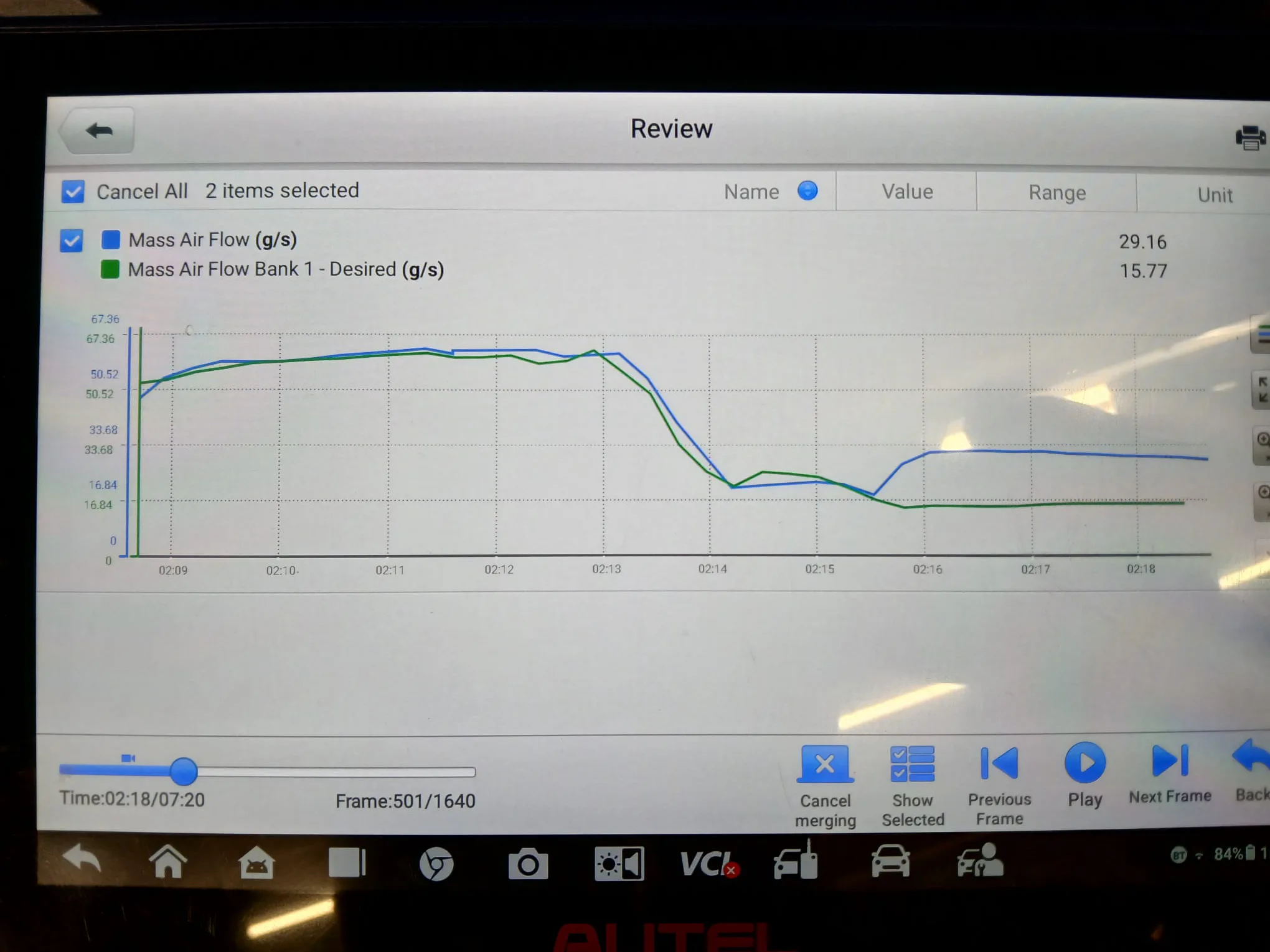 Hier zie je met afremmen dat de gemeten luchtmassa ongeveer 30 g/s is en de auto verwacht ongeveer 15 g/s, op dit moment komt dan ook de foutcode er in, alleen het vreemde is dat dit niet elke keer gebeurd, dus het kan ook een aantal kilometer goed gaan.
