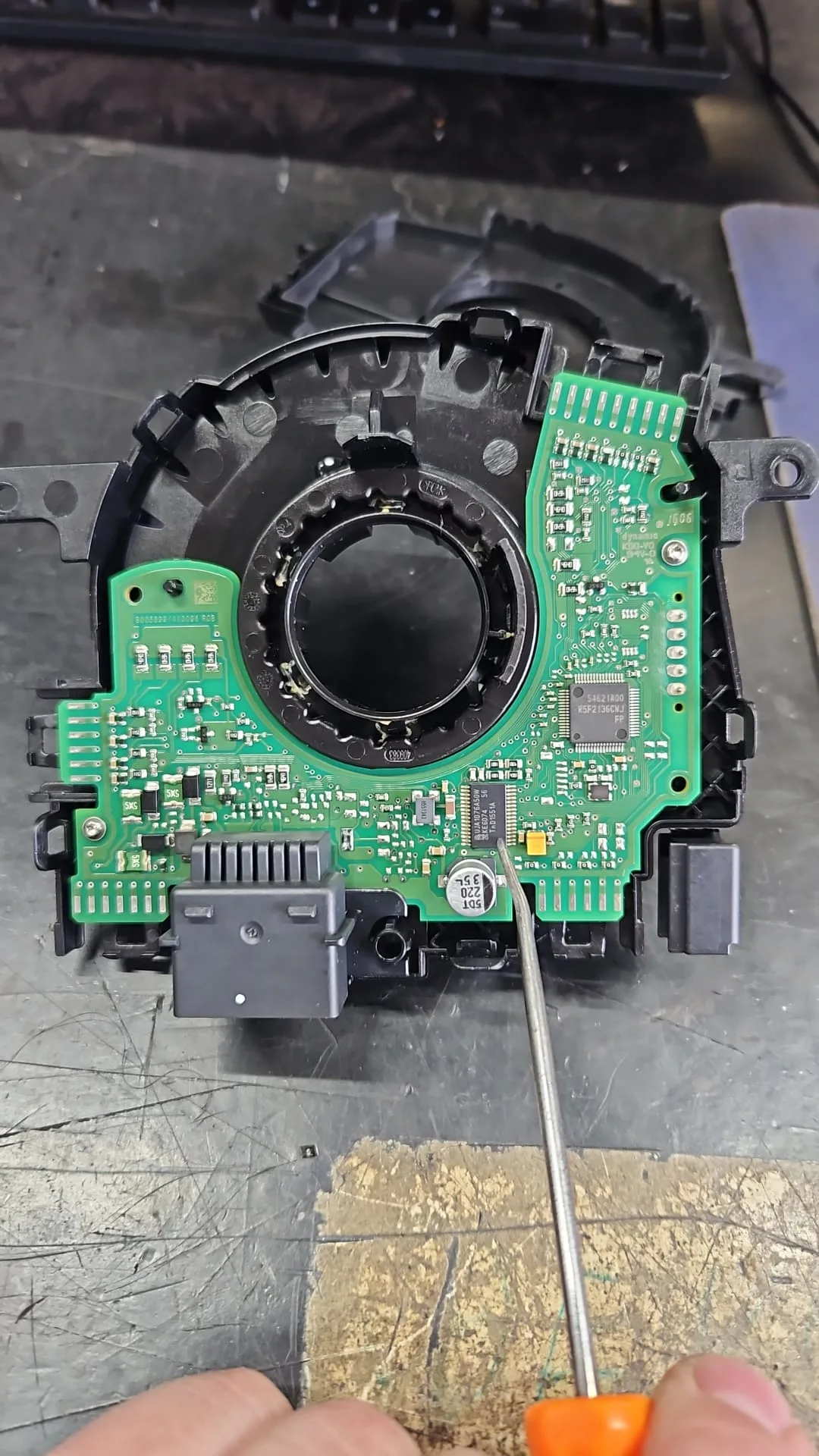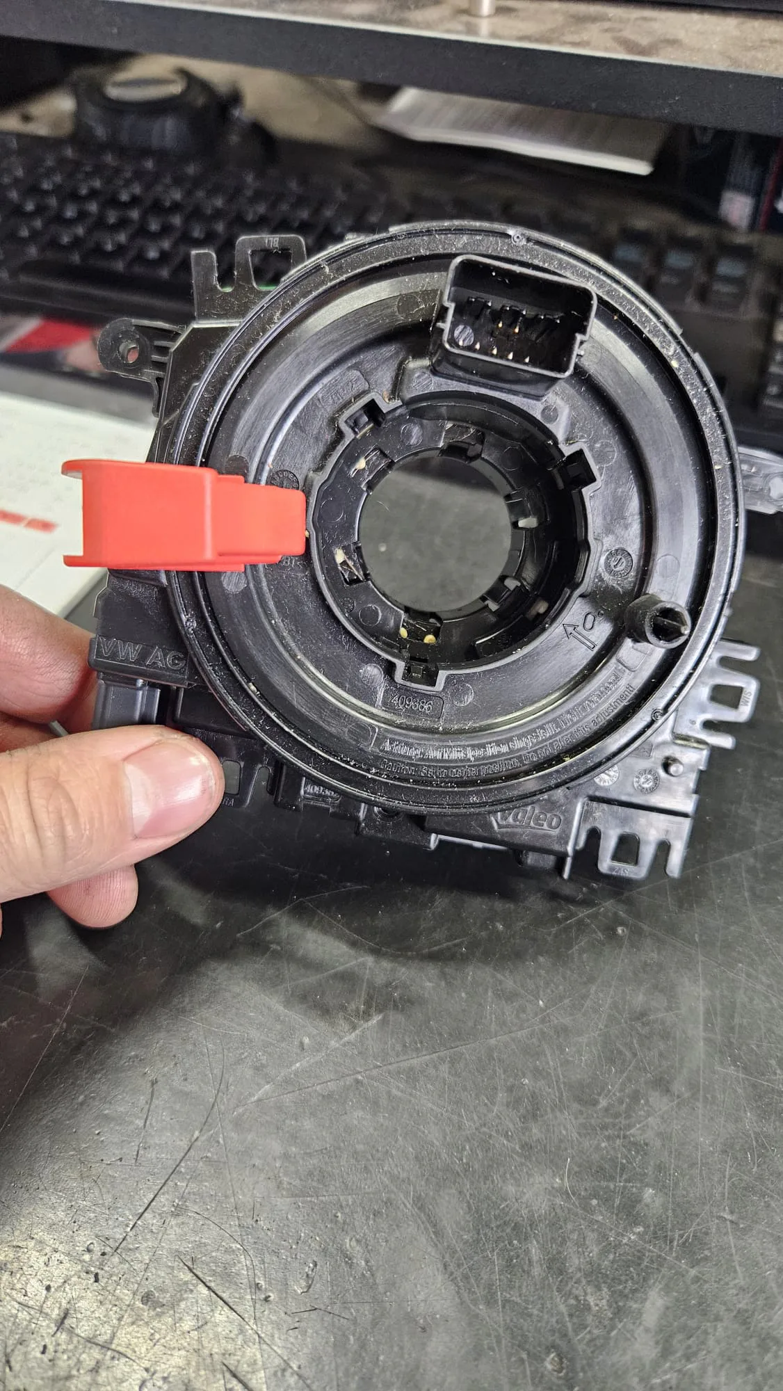 Na vervangen van de klokveer voor een OE type van valleo werkte de schakelaars weer wel maar de cruise control en acc niet meer, ook krijg ik veel foutcodes over de communicatie met de stuurwielmodule. die sleepring blijkt ook de module te zijn, hier zit ook een canbus chip in, zie foto.