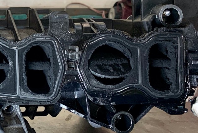 Als wij in onze werkplaats de turbo demonteren, zien we inderdaad overmatige vervuiling. Maar we ontdekken nog iets anders! De variabele schoepen vertonen inslagschade. Dan is er dus tóch meer aan de hand dan alleen vervuiling van de EGR. Gesterkt met deze nieuwe kennis, bijt de monteur zich opnieuw vast in het betere speurwerk. Hij demonteert het hele inlaattraject om alles goed te kunnen schoonmaken. En dan stuit hij op kapotte wervelkleppen (swirl valves)*. Deze zijn door de vervuiling vastgelopen en daardoor afgebroken. De losse delen zijn via de motor door de turbo naar buiten gekomen en hebben de inslagschade veroorzaakt.