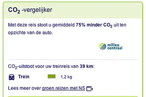 "Als je met de trein reist, stoot je gemiddeld 75% minder CO2 uit dan wanneer je dezelfde reis met een gemiddelde auto zou maken", zeggen NS en Milieu ...